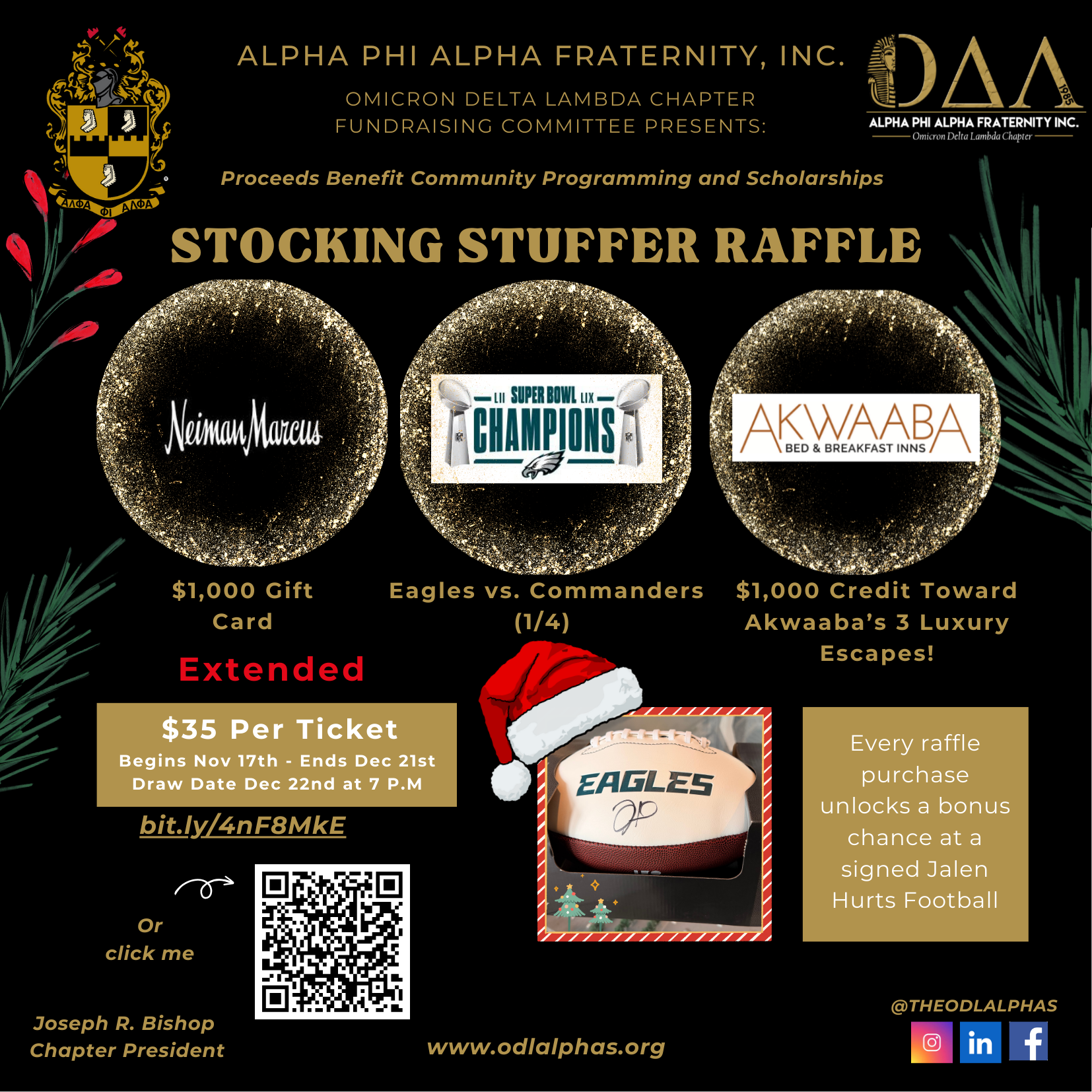 Each raffle purchase counts as one entry…plus each raffle purchase counts towards our bonus prize. A chance to win a Jalen Hurts autographed football. Don’t miss your opportunity to make this holiday season even brighter!