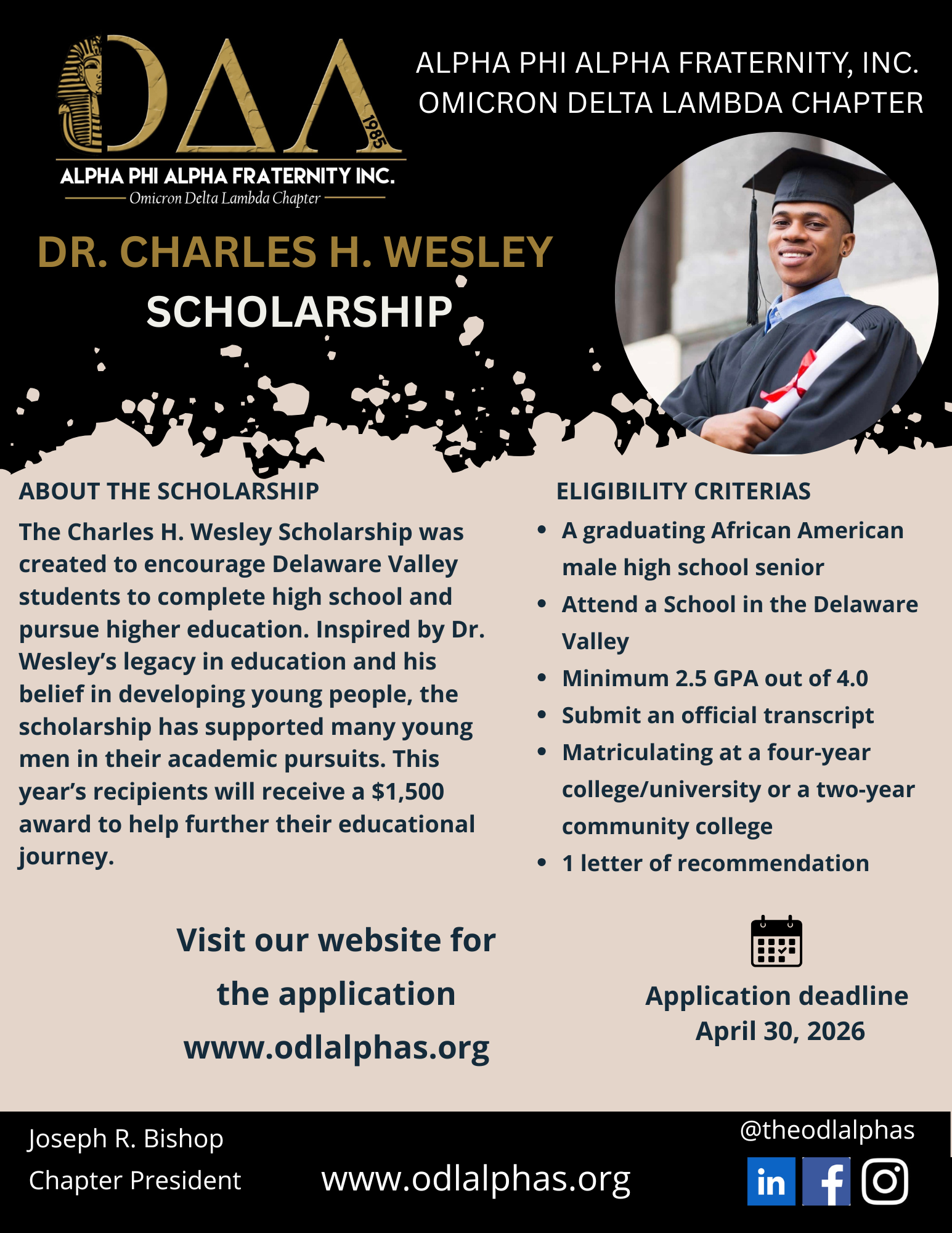 The Charles H. Wesley Scholarship is now open. Eligible students are encouraged to apply